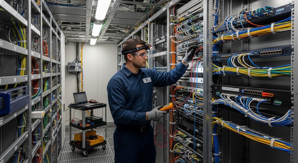 ビルの共用部にある「MDF」と呼ばれる通信の集約箱から、あなたの店舗・オフィスまで、新しい光ファイバーを通すための「管(配管)」が生きているかどうかが最重要です。