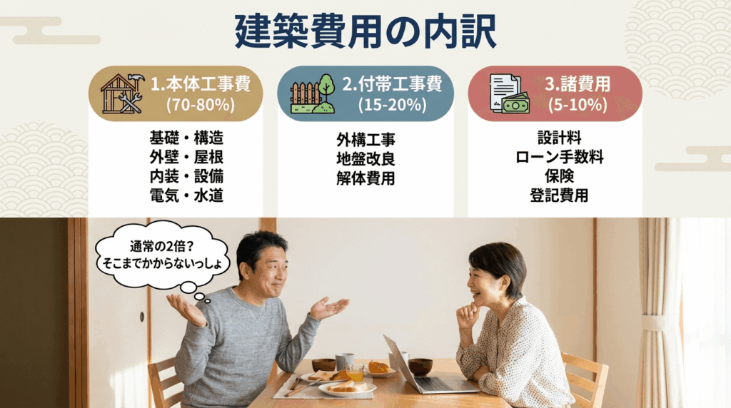 私も最初、「普通の家の2倍?いやいや、そこまでかからんでしょ(笑)」って思ってました。甘かった…。