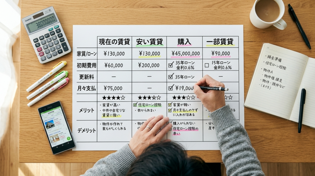 今の賃貸、安い賃貸、普通の購入、一部貸しの4列を作り、月額、5年総額、通勤時間、駐車台数、部屋数を書く。