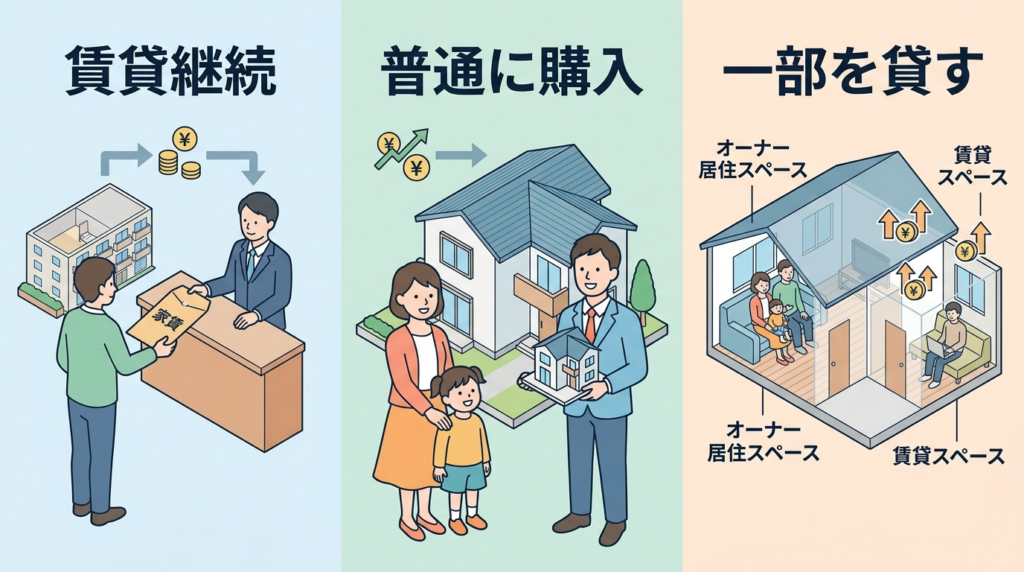 賃貸継続、普通の購入、住みながら一部を貸す。
