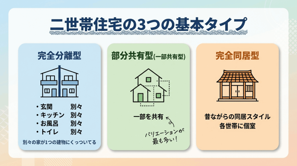 まず基本から。二世帯住宅には大きく分けて3つのタイプがあります: