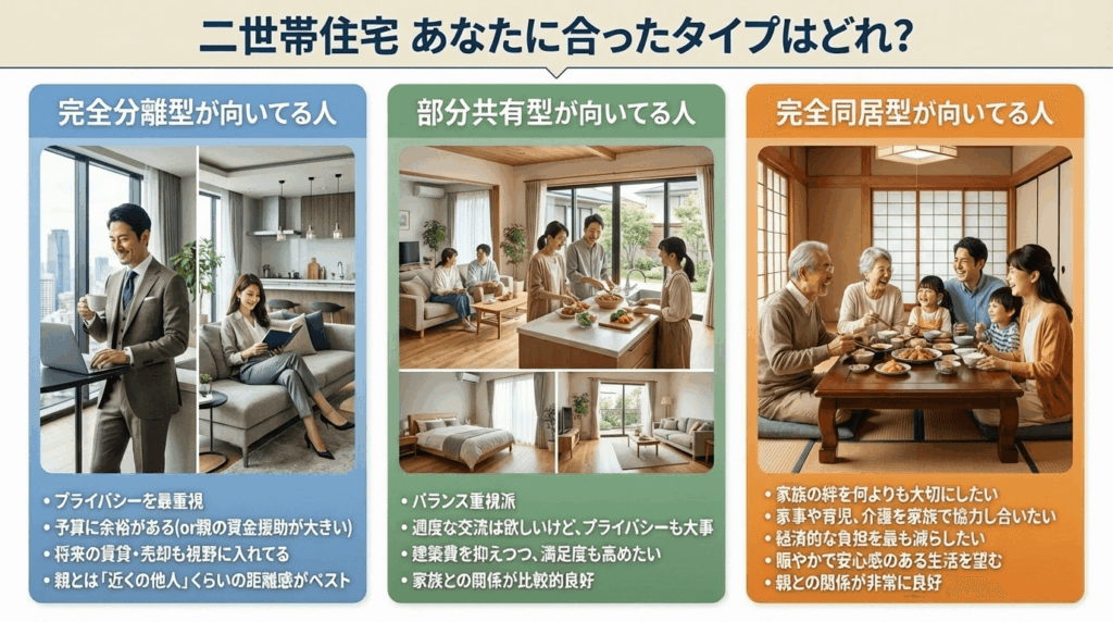 まず基本から。二世帯住宅には大きく分けて3つのタイプがあります: