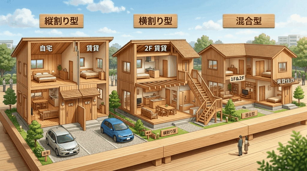 1階を自宅・2階以上を賃貸(またはその逆)にするタイプ。賃貸戸数を増やしやすく収益性が高い反面、上下間の騒音に注意が必要。
