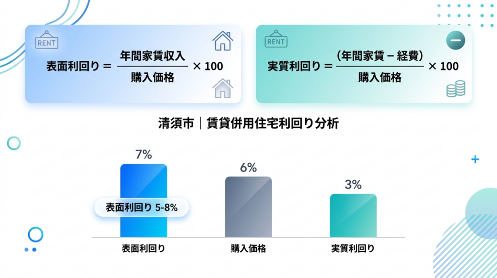 実質利回り(ネット利回り): (年間家賃収入-年間費用)÷物件購入価格×100。管理費・固定資産税・保険料・修繕費などを差し引いた現実的な収益率。