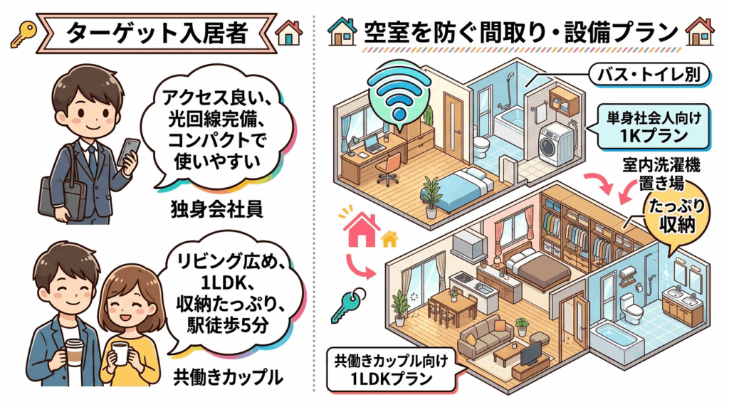 ターゲット層(単身社会人、共働き夫婦など)に合わせた間取り・設備