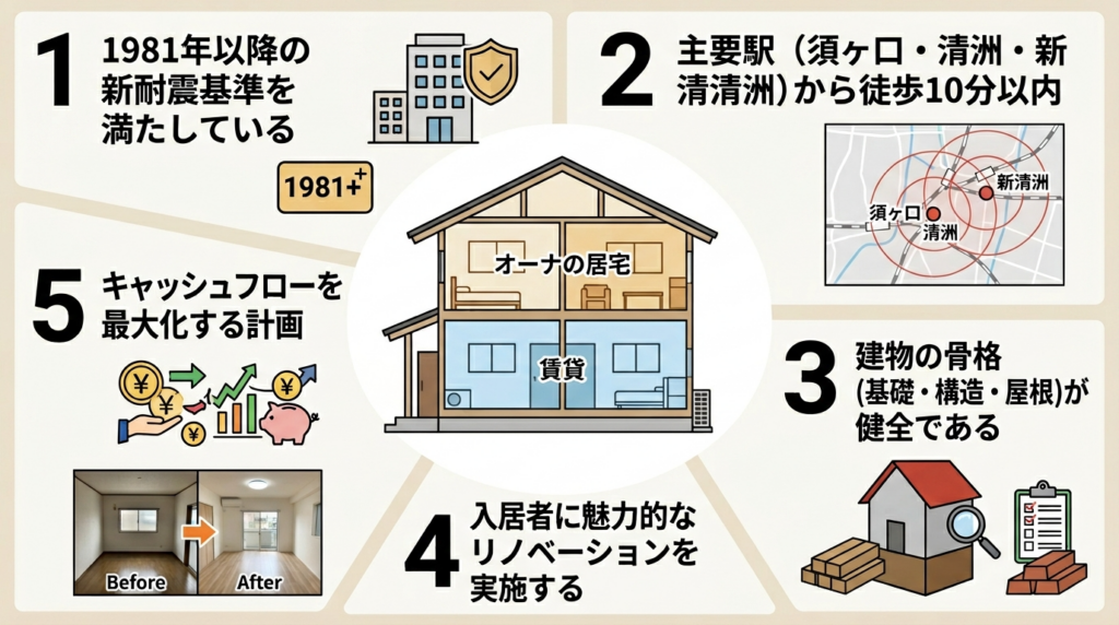 この5条件をすべて満たす物件を清須市で見つけるのは容易ではありませんが、だからこそ見つけたときの収益性は高くなります。