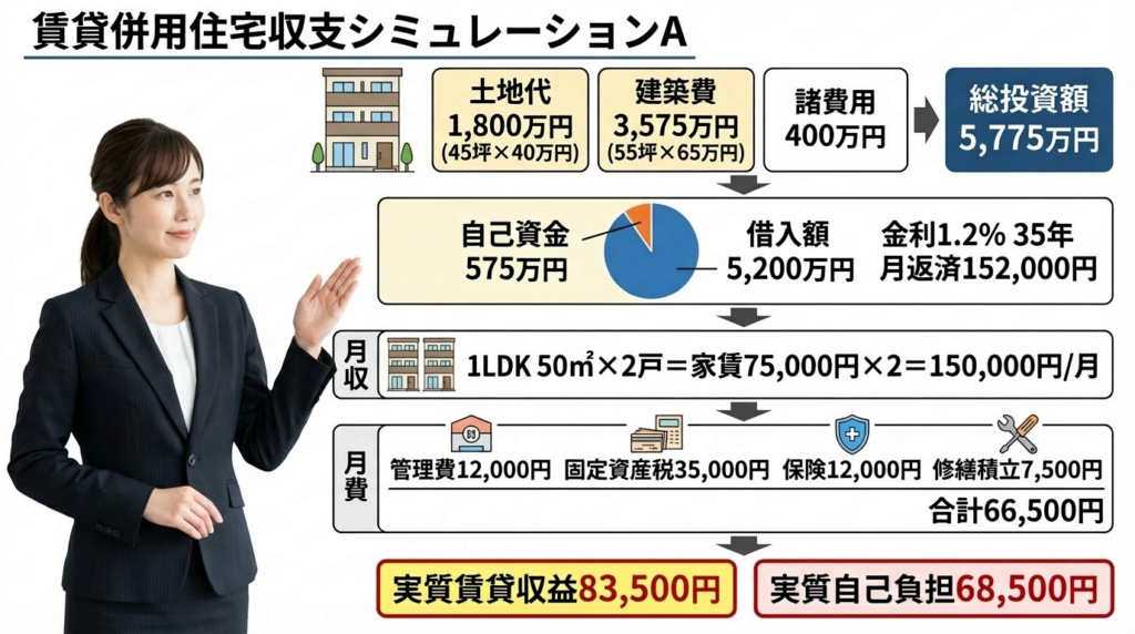 ローン返済 152,000円 − 実質賃貸収益 83,500円 = 実質自己負担 68,500円
