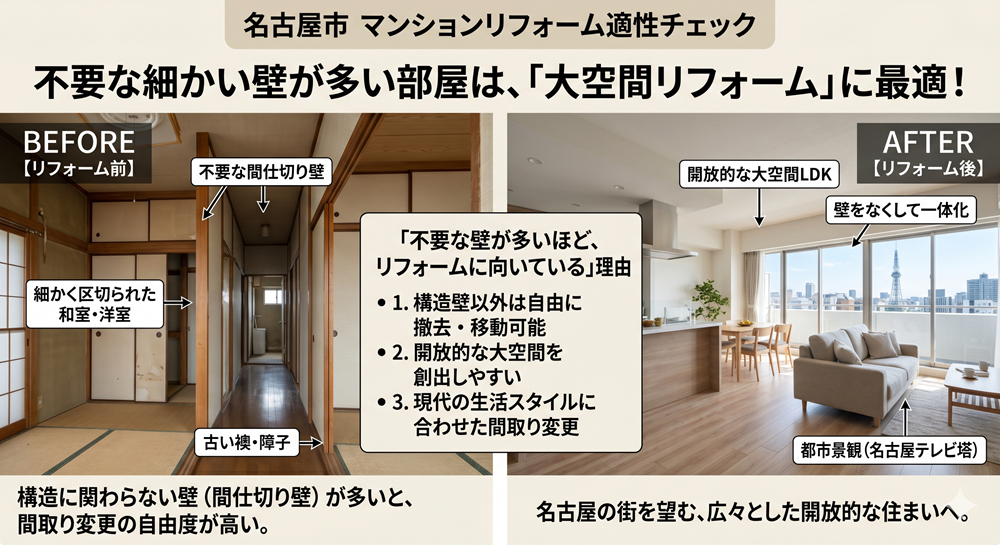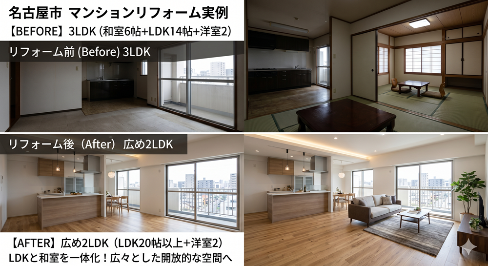 今回は、名古屋市でマンションリフォームを考える人向けに、間取り変更がどこまで可能なのかを、できること・できないこと・見極め方・失敗しやすい勘違いまで含めて、かなり具体的に整理していきます。