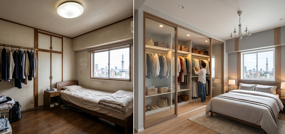 特に名古屋市の中古マンションでは、部屋数はあるのに収納が浅い、押入れの使い勝手が悪い、洗面まわりの収納が少ない、という住戸が少なくありません。