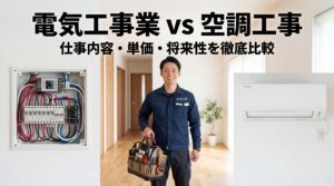 「電気工事とエアコン工事って、結局何が違うの?」 独立を考えている方や、業界に入ったばかりの方から、よくこんな質問を受けます。どちらも「工事」という言葉がつき、どちらも電気工事士の資格が関係してくる。しかし、この2つは似 […]