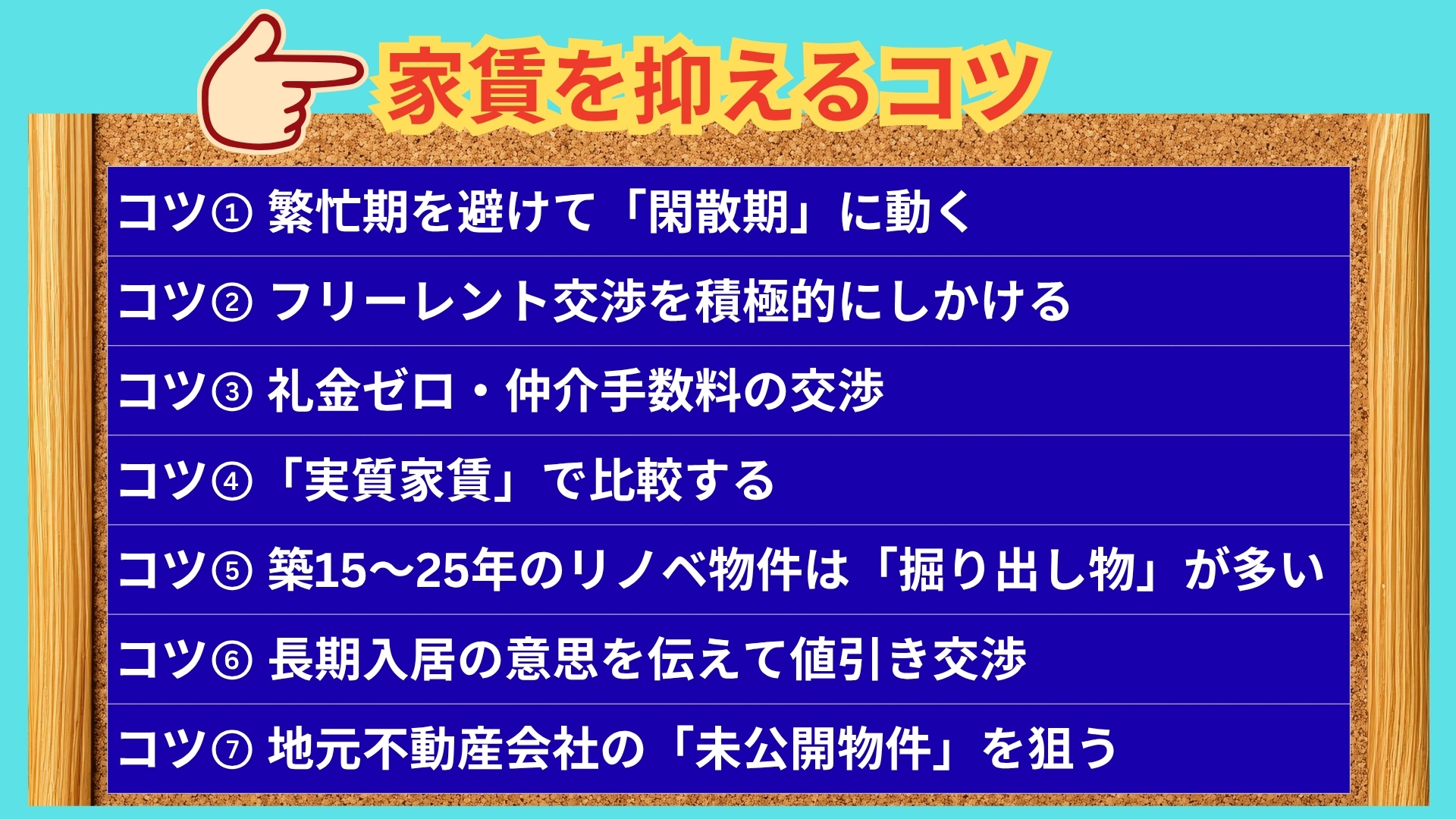繁忙期を避けた行動、フリーレント・礼金交渉、リノベ物件の活用、地元不動産会社への相談——