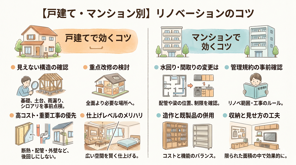 マンションは面積が限られているぶん、内装や設備の印象づくりにお金が集中しやすく、戸建ては屋根・外壁・断熱・配管・耐震など“見えない部分”に予算が吸われやすい。