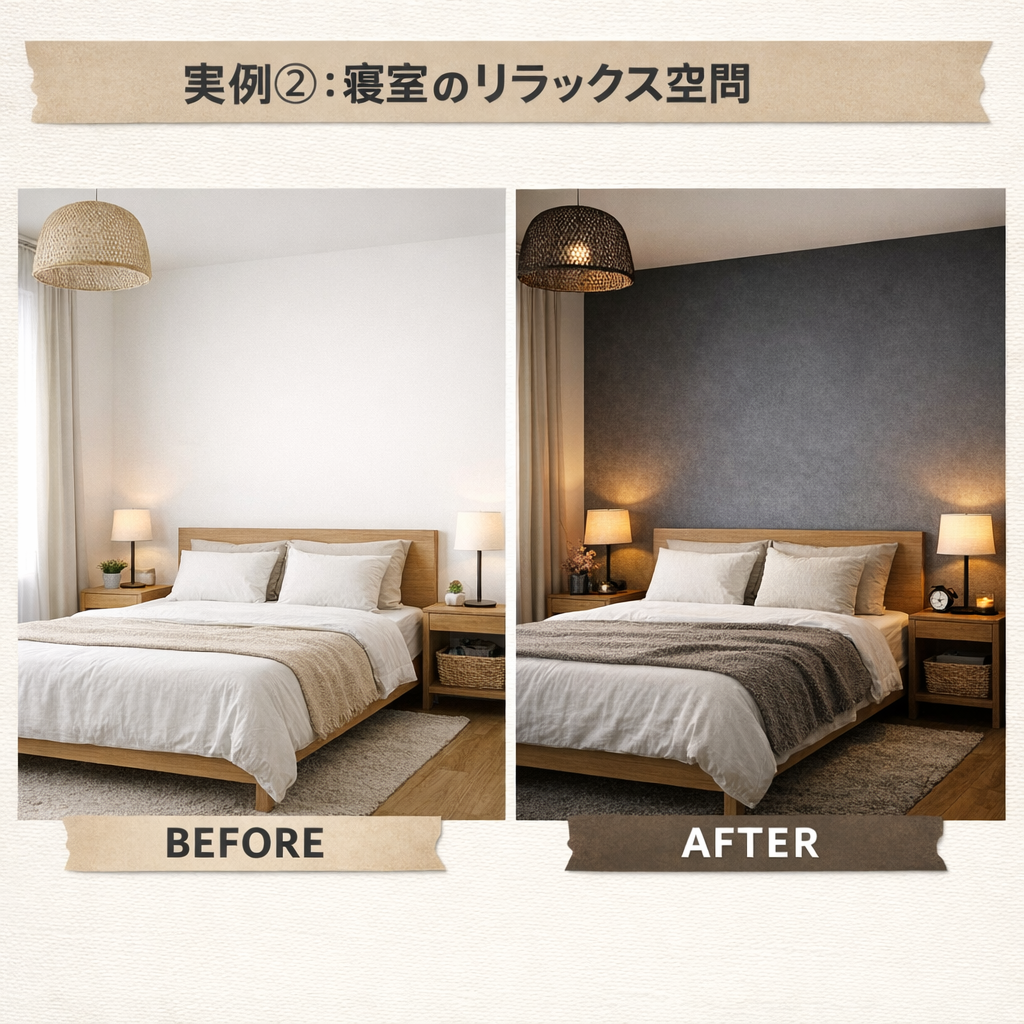 壁紙は部屋の印象を大きく左右します。白からアクセントカラーに変えるだけで、まるで別の部屋に生まれ変わります。